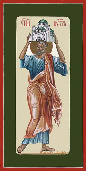 На овој икони приказан је одевен у плави хитон, огрнут смеђим химатионом. Изнад главе држи храм Св.Саве у Београду чиме се симболично приказује да је он, односно његова вера, непоколебљиви темељ Цркве.